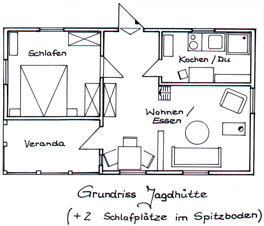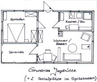 Jagdhütte am "Karlsforst" Terrasse, Diele, Dusche, Küche, Stube, Außentoilette und Schlafgelegenheit für vier Personen.